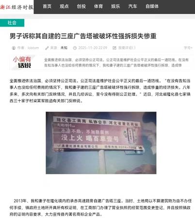 摘要:全面推进依法治国,必须坚持公正司法。公正司法是维护社会公平正义的最后一道防线。在没有告知当事人也没给任何费用的情况下,我和妻子建的三座广告塔被破坏性强行拆除,造成