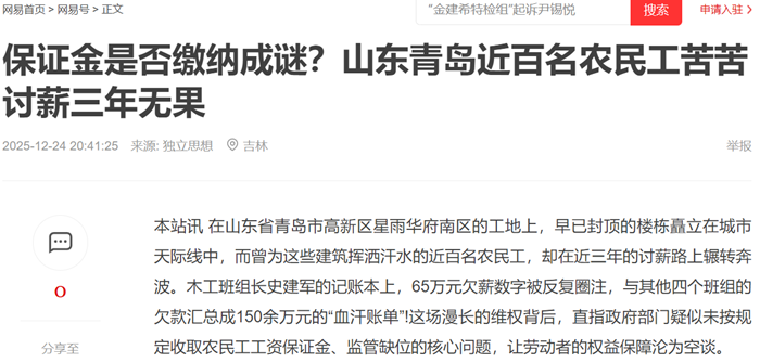 业内人士认为,当行政协调陷入僵局,政府部门都是将解决方案导向司法诉讼。然而,劳务单位起诉总包的工程量纠纷案,审理周期预计长达18至24个月;农民工单独起诉需先确认劳动关系,对流动性强、未签规范合同的他们而言,举证难度极大。更严峻的是,根据政府部门的答复意见书,江苏翔森公司资产已全部抵押,账户余额不足50万元,即便农民工胜诉,作为普通债权人也难以拿到欠薪,法律救济可能沦为“程序正义”的空转。 为讨回血汗钱,农民工们曾多次向青岛市、山东省政府及国家信访局反映情况,但均未获得实质性进展。“这么明确的欠薪问题,怎么就没人管、解决不了?”他们的质问,道出了对权益保障体系的失望。 权益保障路在何方:制度执行与责任担当缺一不可 法律界人士指出,农民工工资保证金制度是保障劳动者权益的重要制度设计,其核心价值在于“预防为先”,而青岛高新区这起事件中,制度执行的缺位让防线彻底失守。政府部门作为监管主体,未能严格落实保证金缴纳要求,事后又以“司法途径”推诿责任,本质上是履职不力的表现。 当前,农民工们仍在讨薪路上苦苦支撑。他们的诉求简单而迫切:查清保证金是否真的未缴纳以及未缴纳的真相及责任归属,早日拿到属于自己的血汗钱。此事不仅关乎个体权益,更拷问着地方政府的治理能力与责任担当,折射出建筑工程领域多层级分包体系下的权益保障漏洞。 媒体在此呼吁,青岛市及山东省政府应切实履行监管职责,成立专项调查组彻查此事:农民工工资保证金究竟是否缴纳?若未缴纳,是企业违规还是监管放水?相关部门是否存在失职渎职行为?尽快给农民工一个明确答复,让制度真正发挥作用,让劳动者劳有所得、权益有保障。媒体将持续关注事件后续进展。(记者张辉 李冰)