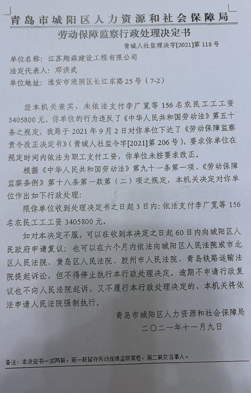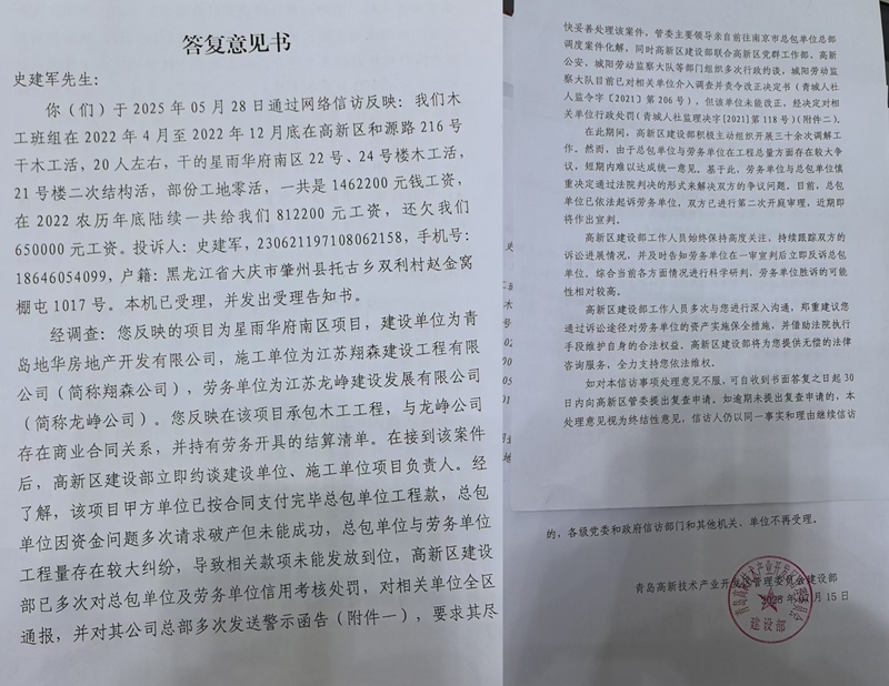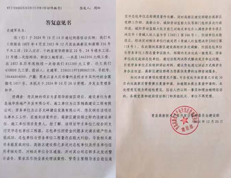 工程落幕,欠薪登场,150余万元账单的三年之困 据史建军等农民工介绍:2022年4月至12月,史建军带领20名木工班组工人,完成了星雨华府南区22号、24号楼木工工作及21号楼二次结构施工。按照约定,该班组应得工资146.22万元,然而2022农历年底仅收到81.22万元,剩余65万元至今未结。 同样遭遇欠薪的还有其他几个班组,其中李广臣混凝土班组2022年在此干活,被拖欠25万元,张传生的架子工班组被拖欠15.4万元。四个班组总计被拖欠150余万元。这些来自不同工种的农民工,共同面临着“干完活拿不到钱”的困境,最长欠薪时间已接近三年。 青岛高新技术产业开发区管理委员会建设部出具的答复意见书(信访件编号WT370000202410155398签发人:周松)证实了农民工们反映的问题。 答复意见书称:该项目建设单位为青岛地华房地产开发有限公司(江苏雨润集团青岛分公司),总承包单位是江苏翔森建设工程有限公司,劳务分包为江苏龙峥建设发展有限公司。多方信息显示,建设单位已按合同向总包单位支付完毕工程款,但总包单位因资金问题多次申请破产未成功,且与劳务单位存在工程量纠纷,导致农民工工资被长期拖欠。 保证金疑云,政策要求与实际执行的脱节 国家明确规定,工程开工前施工单位需缴纳2%-5%的农民工工资保证金,用于应急支付欠薪,这是保障农民工权益的“安全网”。但在该项目中,农民工们从未见到保证金缴纳凭证。