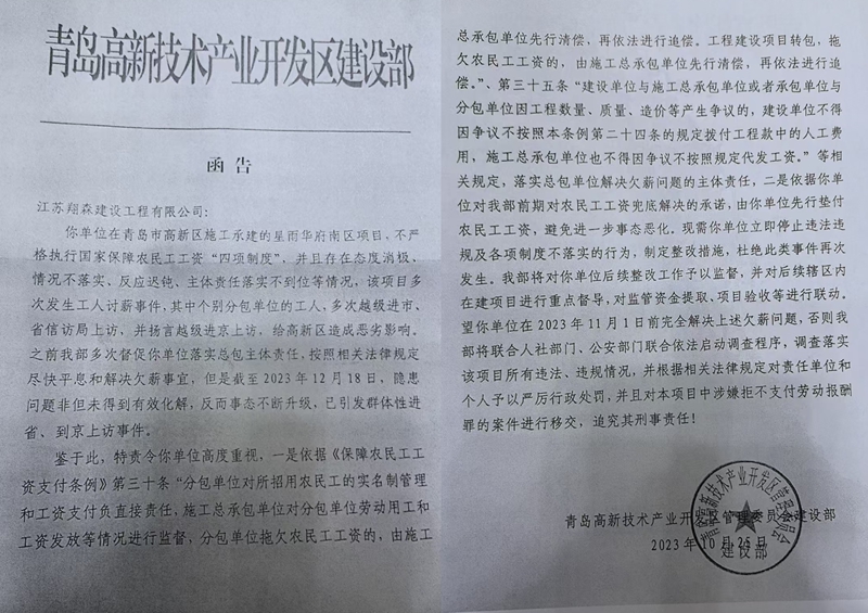 2025年7月14日,史建军与青岛高新技术产业开发区管理委员会建设部徐文全主任的电话录音似乎揭开了关键真相:施工单位在开工前并未缴纳农民工工资保证金!面对质疑,徐文全称在该项目中施工单位没有缴纳农民工工资保证金,其理由是“部分企业符合免交政策”。当史建军追问“建设部是否有责任”时,其仅叹气承认“有一定责任”。 记者曾多次致电高新区建设部副部长王振峰求证,对方均未接听。农民工们表示,他们曾多次追问管委会是否按规定收取保证金,相关领导始终遮遮掩掩、避而不答,这让他们坚信保证金并未缴纳。而建设部徐文全主任的话似乎印证了他们的疑虑,这让他们更加心凉。 事实上,住建部2023年调研显示,全国仍有12%的在建项目未足额缴纳保证金,部分地区为“减轻企业负担”采取“柔性监管”,导致制度形同虚设。即便缴纳了保证金,农民工申请使用需经历11个审批环节、耗时45天,不少人因生计压力被迫妥协,保证金的应急保障功能大打折扣。 监管缺位与责任推诿:维权路上的多重壁垒 史建军等农民工认为,高新区管委会存在明显监管失职。“当初相关领导说不解决欠薪就不给办理开工手续,不让项目开工,可现在房子都封顶了,我们的工资还没着落。”农民工们质疑,若管委会严格执行保证金制度、加强过程监管,不会出现如此严重的欠薪问题,理应承担主要责任。 但建设部出具的答复意见书称管委会做了很多工作:为解决问题,高新区建设部采取了一系列措施,多次对总包单位及劳务单位进行信用考核处罚、全区通报,并向其公司总部发送警示函,管委主要领导还亲赴南京调度案件化解。此外,高新区建设部还联合党群工作部、高新公安、城阳劳动监察大队等部门多次约谈相关单位,城阳劳动监察大队也已介入调查,下达责令改正决定书并作出行政处罚,但问题依然未能得到解决。 对于建设部的答复意见书等文书上的说法,史建军们并不认同:“我们每一次反映问题,这些部门就给出个答复,甚至连个标点符号都不改,就是不解决问题。他们就是不能采取点有效的措施,只是坐在办公室里做空头文章!”