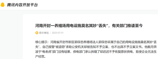 第三次发生在2023年2月13号,郭保忠突然发现养殖场的变压器丢失,询问村电工是否知情,被告知不知道,询问主管所开封祥符区杏花营供电所被告知也不知情。郭保忠赶紧报警,开封市城乡一体化示范区公安分局西湖派出所感到案件数额巨大,及时通报辖区刑警队出警,准备立案侦查。郭保忠随后多次与刑警及派出所办案人夏警官电话沟通案件进展。没过几天,让郭保忠感到意外的是,刑警队办案民警告诉他通过监控发现,2月9号上午九点,车标着“开封市光利高科”(属于国网开封供电公司)字样的人员把他的变压器拆除拉走了,这不属于盗窃事件不予立案。郭保忠认为对方事先没有通知,虽然区域划归新区但供电管理仍然隶属开封市祥符区杏花营供电所,他们也不知情的情况下,谁拆走都是盗窃行为,要求刑警及派出所出具不予立案书面通知书却被拒,警方要求郭保忠找派出所处理,郭保忠与夏姓警官多次电话沟通被告知他们会积极协调解决。然而三个月后,警方却以供电部门对所谈条件不同意为由将事件搁置。郭保忠就再与供电公司西区供电中心负责人胡汴生沟通。从最初他们之间的电话通话录音中可以听出,胡汴生承认是他们搞错了,也承认变压器所有权归养殖场。胡最初也表达出尽快解决的意见,然而却因多种原因双方迟迟达不成共识,致使郭保忠开始信访,现在信访已经超期了也没有给一个答复。郭保忠不理解自己的财产在不知情的情况下“丢失”明明就是被盗案件,为啥公安机关不予立案?他要求出具通知书为啥被拒?西区供电部门承认自己错了为啥不予解决处理? 国网供电部门肩负着各辖区内党、政、军、机关、工农业生产、各大商户及居民生活供电服务工作。电力是当今社会发展最重要的能源之一,电力部门作为自然垄断行业,其长期行政垄断经营有其必然性,但也存在一些问题。随着国家一系列的改革措施,其应该做到“人民电力为人民”,把满足人民追求美好生活的电力需求作为电力公司的出发点和落脚点。某些供电部门及人员的特权思想、以权谋私、刁难用户的作风早已被老百姓戏称为“电老虎”。对于“电老虎”的傲慢,吃过苦头的郭保忠敢怒不敢言,但他相信这些毕竟是少数人的行为,希望他的问题会引起上级领导的重视,会给他一个满意的答复,我们也将继续关注此事并跟踪报道。对于此事,当事人提供了大量的通话录音证据,必要时可向社会公开曝光。 (图\文李军 梁思)