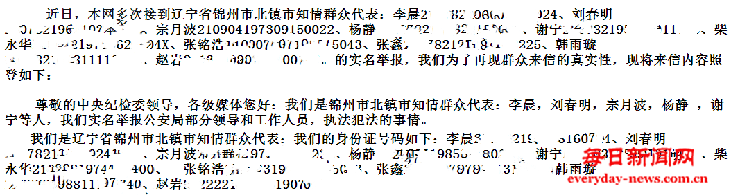 我们在向省市县三级主管部门申诉被推诿、拒绝的情况下,万般无奈,冒昧给你们写信,是为了实名举报辽宁省黑山县公安局相关领导,以及1014专案组成员高浩,马驰、朴鑫泽、赵阳、赵春雨,张健、谭德勇,孙勇、付兆通,张饶、侯建,朱博,张国宇等人。这些所谓的人民警察唯上不唯法、唯权不唯实,我们认为是受原辽宁省公安厅厅长王某伟的指使,于2021年10月起,将锦州北镇市的张力中及其所属公司的领导、职工等29人定性为犯罪嫌疑人,并且采取强制措施进行迫害追诉。我们认为是在政府有关部门领导下,把我们参与当地蔬菜批发市场建设和管理,以及公司自行垫资在政府有关部门领导下,参与城市新区开发和基础建设的正常工作,说成是强迫交易、串通投标、非法采矿等,强行拼凑出张力中、刘春涛、韩宝顺等10人,定性为黑社会性质组织。将为北镇市农村经济和城市基础建设发展,做出突出贡献且受到农业部和省市县多次表彰奖励的民营企业家张力中抓获,不顾其在本地有固定住所的实际情况,非法采取指定监视居住、非法拘禁整整6个月;其他同案的北镇群众刘春涛、韩宝顺、曲生、张力夫等15余人均被被指定蜒居住,被统一关押在黑山镇前进胡同1号。专案组人员,他们利用公权力变相掠夺、侵吞企业家的合法财产,向上级邀功,人为制造冤假错案件。