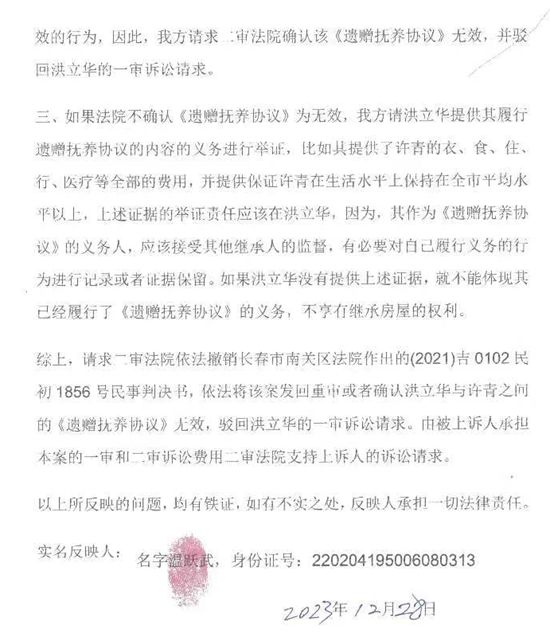 二、在温明义与许青于1980年结婚时,我三妹妹温洪英并未成年,因此与温明义和许青有扶养与被扶养关系。而法院判决书236号和(2021)1856没有考虑,因此许青的份额应有温洪英份额。 温家人不服提出上诉 对于这个判决,我们一家人不服,提出上诉。我们认为一审法院认定事实不清,导致适用法律错误: 一、一审法院认定洪立华和许青之间的《遗赠扶养协议》有效是错误的。因为,位于长春市南关区树勋街16-1号省计委楼2单元305室的房屋是上述人的父亲温明义的个人财产,许青无权处分。 二、我国关于房改房的权属关系认定上一直是从严的,即只有本企业的职工才有权利拥有本企业的房改房,购买房产,其他人是没有权利成为企业的房改房的权利主体。本案中,上述人的父亲温明义因单位的政策,特给与其购买本单位的房屋产权的机会,单位给与购买本单位的房屋的政策前提是本单位的职工,他人不能成为房改房的权利主体,因此房改房的权利主体身体具有特定性。本案中,许青虽然和温明义是夫妻,但是上述房产不属于双方的共同财产,是温明义的婚后个人财产,因此,许青将上述本属于温明义的财产以遗赠抚养协议的方式处分给洪立华是错误的,也是无效的行为,因此,我方请求二审法院确认该《遗赠抚养协议》无效,并驳回洪立华的一审诉讼请求。 三、如果法院不确认《遗赠抚养协议》为无效,我方请洪立华提供其履行遗赠抚养协议的内容的义务进行举证,比如其提供了许青的衣、食、住、行、医疗等全部的费用,并提供保证许青在生活水平上保持在全市平均水平以上,上述证据的举证责任应该在洪立华,因为,其作为《遗赠抚养协议》的义务人,应该接受其他继承人的监督,有必要对自己履行义务的行为进行记录或者证据保留。如果洪立华没有提供上述证据,就不能体现其已经履行了《遗赠抚养协议》的义务,不享有继承房屋的权利。 综上,请求二审法院依法撤销长春市南关区法院作出的(2021)吉0102民初1856号民事判决书,依法将该案发回重审或者确认洪立华与许青之间的《遗赠抚养协议》无效,驳回洪立华的一审诉讼请求,由被上诉人承担本案的一审和二审诉讼费用二审法院支持上诉人的诉讼请求。
