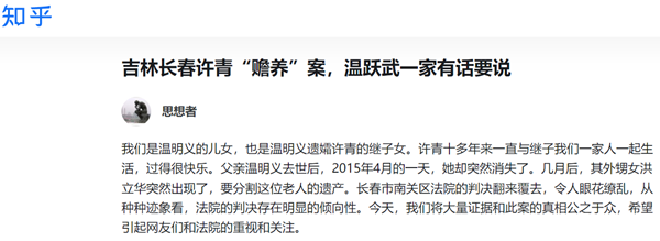 我们是温明义的儿女,也是温明义遗孀许青的继子女。许青十多年来一直与继子我们一家人一起生活,过得很快乐。父亲温明义去世后,2015年4月的一天,她却突然消失了。几月后,其外甥女洪立华突然出现了,要分割这位老人的遗产。长春市南关区法院的判决翻来覆去,令人眼花缭乱,从种种迹象看,法院的判决存在明显的倾向性。今天,我们将大量证据和此案的真相公之于众,希望引起网友们和法院的重视和关注。 许青赡养案的来龙去脉 许青(原名许青芳)女1934年4月14日生,原配偶2006年11月15日已故后,许青、温明义晚年生活一直由温跃武及其妻子周敬兰夫妇赡养,2006年11月15日温明义去世后,许青仍一直由温跃武、周敬兰夫妇赡养。——引用自长春市南关区民康街道西门里社区居民委员会出具社区证明。
