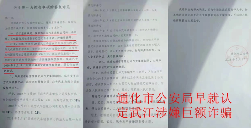 "这些文件上的签名都不是我签的,我直到2020年被法院传唤,才知道股权早已被篡改。"陈一为出示了吉林迪安司法鉴定中心的报告,该报告明确指出,2012年《通化市北方汽车出租有限公司股东会决议》、2014年《通化市北方汽车销售中心股东转让出资协议》等关键文件上的"陈一为"签名,均非其本人书写。更为关键的是,武江在2015年签署的《确认书》中,亲口承认"股权及法人变更未经陈一为同意",甚至在电话录音中多次承诺"会将股权恢复至陈一为名下"。 此外,通化市公安局在2021年出具的《关于陈一为控告事项的答复意见》中,已明确认定"武江提供虚假材料、虚构贷款用途取得550万元贷款的行为涉嫌骗取贷款罪",并于2020年9月17日对该案立案侦查,且称"现已依法移送起诉"。(2020年7月19日,通化市东昌公安局专案组录音录像质证会资料显示,武江本人承认虚构房地产开发事实,骗取陈一为产权证用于银行贷款550万元。) 陈一为认为,武江等人的诈骗、职务侵占、虚假诉讼行为,以及指使陈秀忠私刻公章、伪造签名的一系列操作,均已触犯刑法相关规定。但公安机关却避重就轻,存在拖案、不立案、不查案等问题,其违法渎职行为俨然成为武江等人的"保护伞",最终导致了如今的局面。 报案五载:漫漫维权路,罪犯仍逍遥 2020年3月,远在深圳的陈一为被召回通化,因北方汽贸的债务纠纷被法院传唤,此时他才得知自己的公司早已被武江、陈秀忠掏空。4月22日,陈一为向通化市公安局东昌分局报案,主张武江涉嫌合同诈骗,却在6月29日收到了《不予立案通知书》,通知书中给出的理由竟然是"未发现犯罪事实"! "股权被伪造签名篡改,嫌疑人本人都已承认,怎么能说没有犯罪事实?"陈一为对此不服,先后提出复议、复核。2020年7月,东昌分局维持原不予立案决定;同年12月,通化市公安局复核后,虽认定武江涉嫌骗取贷款罪,但对陈一为控告的合同诈骗、职务侵占等核心诉求,仍以"属于民事纠纷"、 "不涉嫌犯罪"为由予以驳回。 此后数年,陈一为持续向通化市委、市政府、政法委等部门反映情况,甚至向省委巡视组实名举报。通化市委主要领导多次作出"认真调查"的批示,通化市市场监督管理局经调查后也确认"武江、陈秀忠冒改股权及法人事实成立",并将公司登记状态恢复至原有状态,法院也启动了对相关民事诉讼的调查工作。然而,即便如此,公安机关仍始终未对武江、陈秀忠采取任何强制措施。 "我曾提议召开三方听证会,把所有证据摆到台面上说清楚,但这一建议并未被采纳。"陈一为无奈的表示。据陈一为提供的证据,武江曾对沈阳的董强扬言:"通化市高层领导有我朋友,谁也整不了我。虽然陈一为是举报人,但公安局现在查的不是我,而是陈一为,他已经被公安局监控了!"截至2026年2月,距离陈一为首次报案已过去近六年时间,涉嫌诈骗的嫌疑人依旧逍遥法外,而陈一为的公司却因背负武江等人嫁祸的巨额债务,早已濒临破产。 值得一提的是,2020年4月23日下午,在通化市东昌法院会议室,东昌区法院院长张丽娟曾询问执行局局长马林:"武江这个人你了解吗?"马林回应道:"这个人我知道,外地的情况不清楚,单在通化市,被他骗走的资金少说也有七八千万!" 据陈一为介绍,此案已得到中央、省、市各级党委政府领导的关注与批示(包括原全国人大常委会委员长栗战书)。在陈一为再次反映相关问题后,时任副省长、通化市委书记孙简也作出了深入调查的批示,然而这份重要批示竟被扣押长达一年多。涉案人员如此猖獗,背后问题极为严重,若不采取有力措施,此案恐将继续陷入久拖不决的困境。 核心症结:认定部分犯罪,为何不抓嫌疑人? 梳理整个案件脉络,核心矛盾始终聚焦于"公安机关已认定部分犯罪事实,却未对嫌疑人采取强制措施"这一关键点上。通化市公安局在答复意见中称,武江涉嫌骗取贷款罪已移送起诉,但对于其虚构开发事实、骗取公司控制权的行为,却认定"不构成诈骗";对于陈秀忠伪造签名、私刻公章变更股权的行为,更是以"陈一为在转贷时签字,推定其知情"为由,将案件定性为"民事纠纷"。