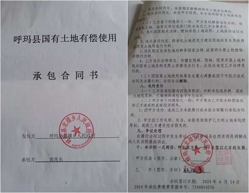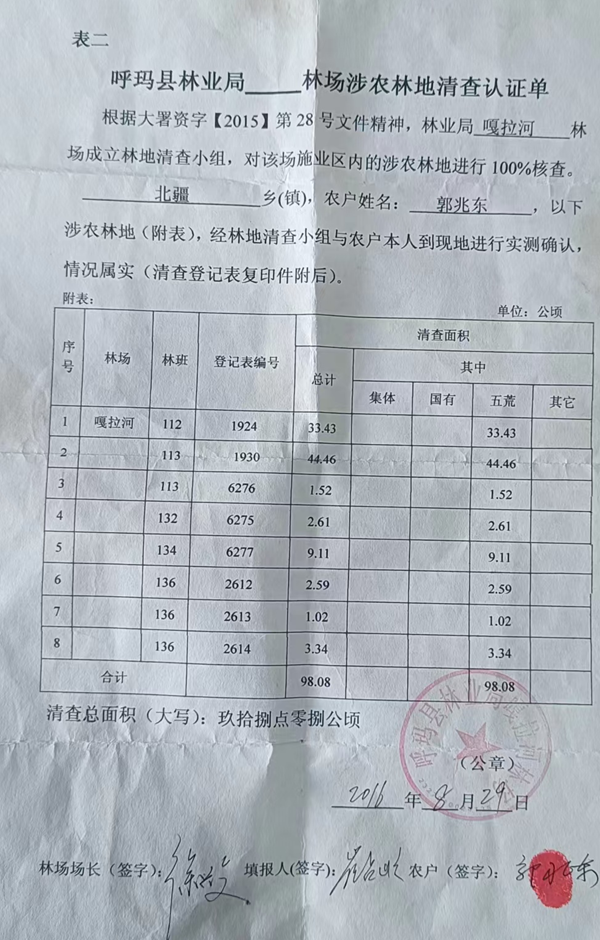 更吊诡的是:根据种植户提供的录音文件,林政股负责人李伟民一边要求农户必须有乡政府承包合同才算合法,一边又直接通知乡政府不得与该农户签约,用“自设矛盾”的方式,将农户逼至春耕无望、土地面临撂荒的绝境。 耕地来源清晰:林场认证、有偿承包,权属合法有据 根据郭兆东提供的大量书证,其耕地权属链条完整可查:2016年从原耕种人处流转取得,同年经呼玛县嘎拉河林场清查认证,直接确权至其名下,总面积98.08公顷,其同时还持有《涉农林地清查认证单》合法凭证 。