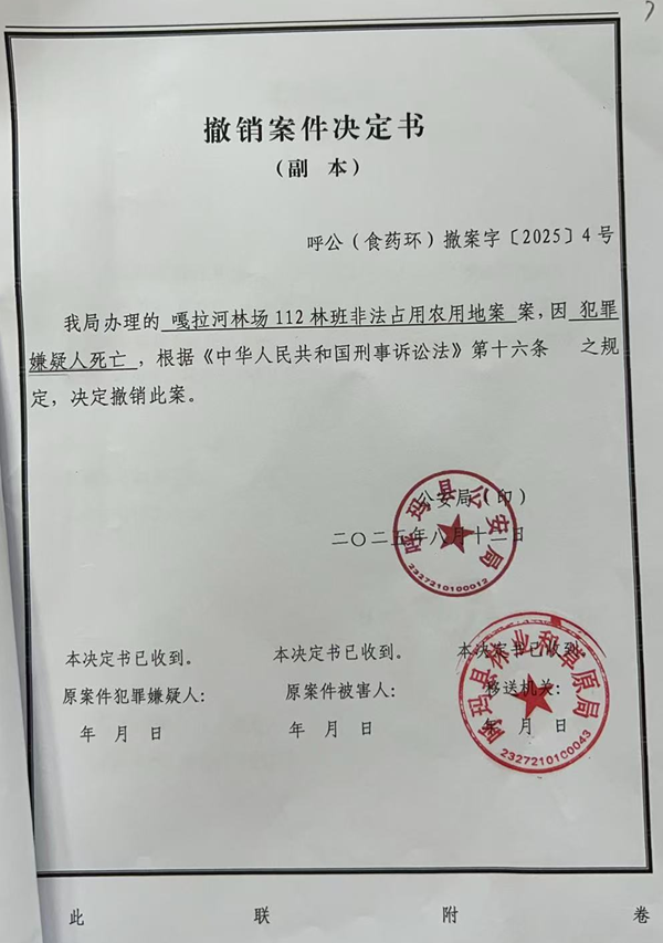 本站讯 眼下春耕在即,黑龙江省呼玛县种植户郭兆东却陷入无地可种、投诉无门的困境。他合法流转、持续耕种多年的98.08公顷耕地,被当地林草部门以“涉案”、“无经营主体”为由禁止耕种;而关键事实是,呼玛县公安局和呼玛县林业和草原局早已出具了《撤销案件决定书》,该案已正式结案。