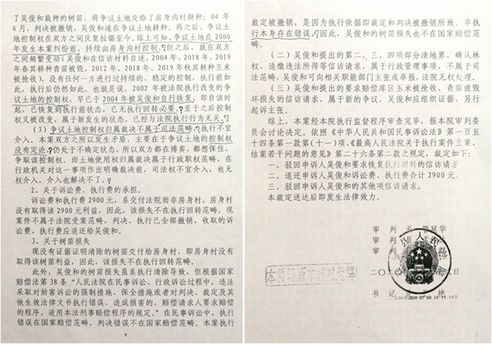 为了早日解决问题,吴俊和还多次去北京最高人民法院反映问题。据悉,最高法、省高级法院和长春中法对于吴俊和反映的问题都十分重视。2019年1月,最高人民法院开始挂网督办,但是农安法院执行局执行科长张德臣等人居然欺骗最高法,并没有执行。无奈,吴俊和再次去最高法院,最高法于3月、5月再次连续挂网督办,并同时给吉林省高级法院下发监督函。吉林省高级法院于2019年5月开始督办,并于8月份专门给长春中级法院下监督函,长春中级法院也给农安法院下函督办。但是,农安法院居然还是拒不执行! 农安法院再出“奇葩”裁定 在吴俊和等人不断上访和上级的压力下,2019年11月1日,农安法院就吴俊和等人申诉上访问题专门召开听证会,在此次听证会上,吴俊和及巴吉垒镇政府要求将位于上河湾水库库区的裸露地交还吴俊和,要求对方补偿在其霸占期间所造成的经济损失。记者全程旁听了庭审过程。在庭上,对于吴俊和及巴吉垒镇政府提出的证据和主张,伏龙泉镇政府和房身沟村方面没有提出任何异议。但是,2020年7月28日,农安县法院却再次驳回了吴俊和的申诉。
