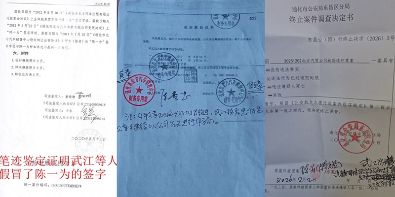 本站讯 2026年春节前夕,吉林省通化市北方汽贸集团(简称"北方汽贸")董事长陈一为,伫立在濒临破产的公司门前,手中紧攥着一叠沉甸甸的证据材料——司法鉴定书、嫌疑人确认书、法院判决书、公安机关立案文书……这些足以证明武江、陈秀忠等人涉嫌巨额诈骗的铁证,却未能将嫌疑人绳之以法。自2020年报案至今,陈一为历经公安机关三次不予立案、多次复议复核无果的困境,而涉嫌诈骗的武江,依旧在通化市面上自由活动。而该案早在2020年便被省委巡视组列为通化市两大重点举报信访案之一,此案今天的结果,不仅令陈一为十分尴尬,恐怕就连对此案做过批示的领导们和巡视组无地自容! 铁证如山:诈骗事实脉络清晰 大量铁证证明,2009年,时任通化市超越高科电子有限公司董事长的武江,以"开发北方汽贸所在地地块并推动公司上市"为诱饵,向陈一为借走北方汽车出租公司的房照,随后在农联社成功贷款550万元。2010年,双方正式签订《股权转让协议》,武江承诺以5000万元现金加十套开发后的商品房为对价收购北方汽贸,并约定6个月内付清全部款项。
