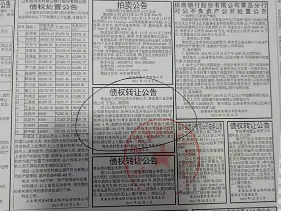 2019年10月30日,青岛农商行莱西支行通过金诺拍卖公司,将该笔金融债权以1650万元的价格,转让给了青岛瑞守建筑科技有限公司,并于2019年12月6日在山东法制报刊登公告。可经查实,青岛瑞守建筑科技有限公司系一人有限责任公司,其经营范围中根本没有金融资产收购、管理、处置相关项目,完全不具备受让金融债权的法定资质!