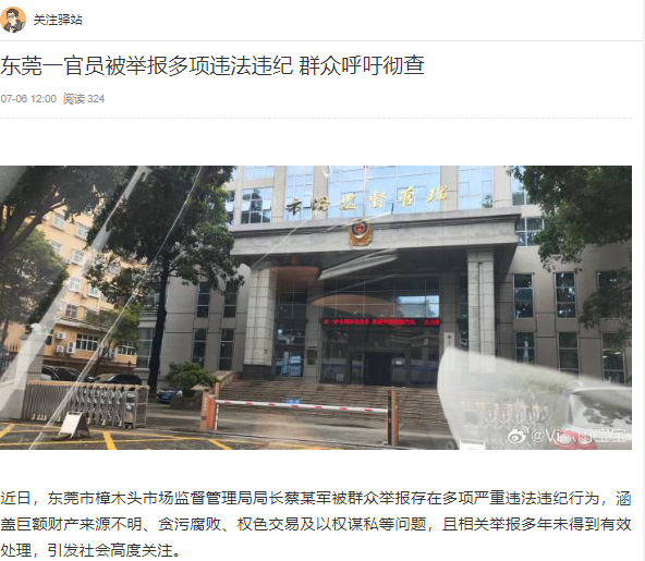 近日,东莞市樟木头市场监督管理局局长蔡某军被群众举报存在多项严重违法违纪行为,涵盖巨额财产来源不明、贪污腐败、权色交易及以权谋私等问题,且相关举报多年未得到有效处理,引发社会高度关注。