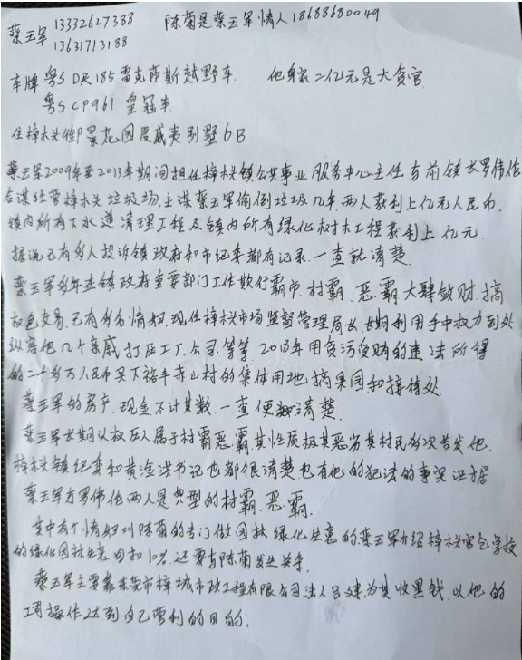 目前,当地群众强烈呼吁上级纪委立即介入调查,彻查蔡某军违法违纪行为,给群众一个交代以维护风清气正的政治生态与健康有序的营商环境。针对反映问题将持续关注。