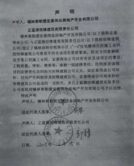 6300万元棚改专项贷款“错位”流向引争议 ——锡林郭勒盟宏基伟业公司称“被负债”盼厘清刑责 针对“6300万元棚户区改造专项贷款未用于约定项目”的指控,锡林郭勒盟宏基伟业房地产开发有限公司(下称“宏基伟业”)25日致函多家新闻媒体,称公司原股东可能虚构交易、冒用名义骗取贷款,并已向检察机关申请立案监督。目前,锡林浩特市人民检察院表示已受理相关申请,将在三个月内给出办理结果。